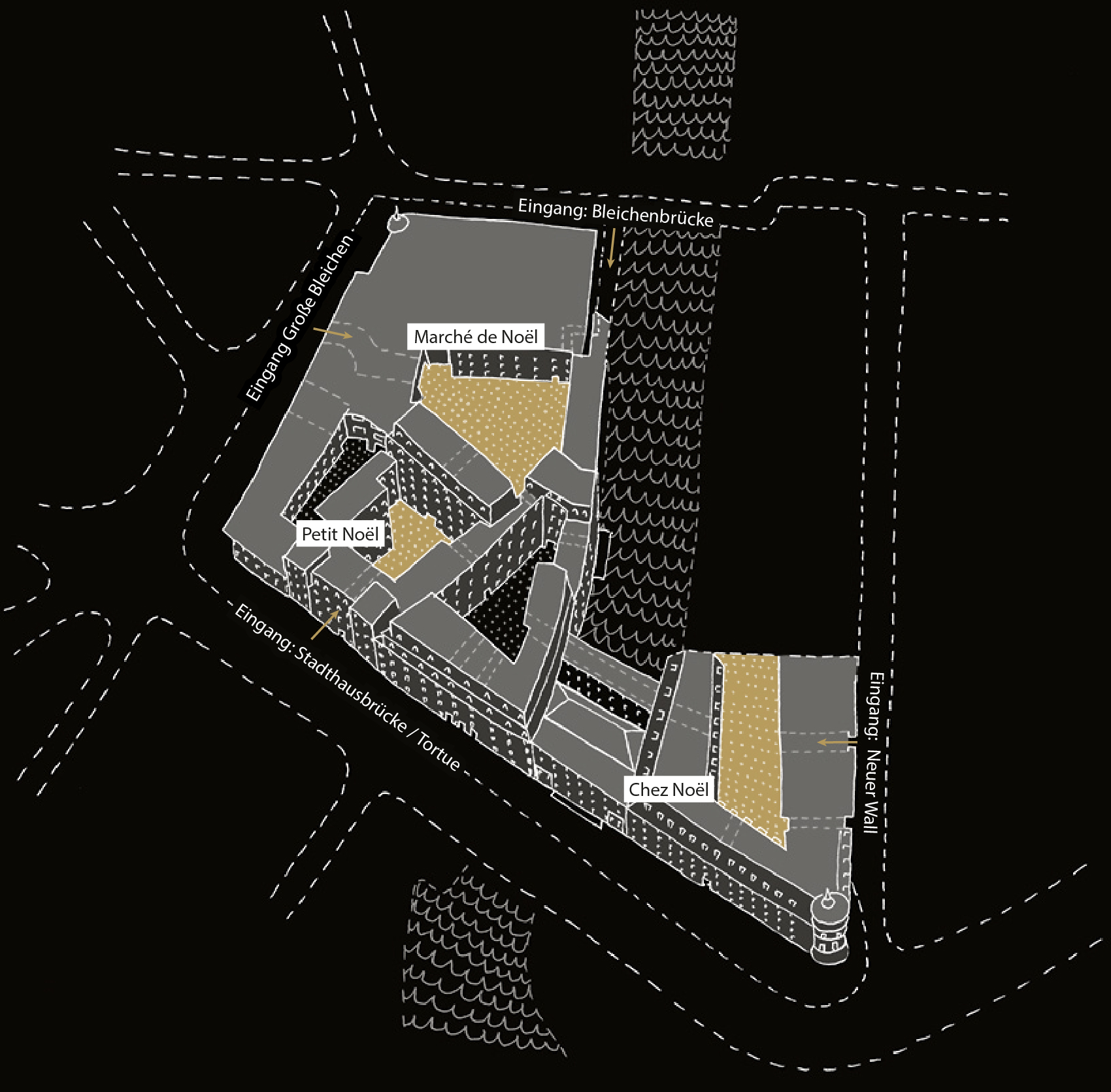 Der Marché de Noël befindet sich im Bleichenhof im Ensemble der Stadthöfe und ist ein zentraler Anlaufpunkt. Dieser Weihnachtsmarkt besticht durch seine einzigartige Atmosphäre, die mit speziellen kupferfarbenen Glühweintassen, gemütlichen Sitzgelegenheiten samt Fellen, überdachten Krippentischen und Holzhackschnitzel für warme Füße punktet. Das Herzstück des Marktes bilden zwei große Rundhütten mit Kupferkuppeln, die von festlich dekorierten Holzhütten umgeben sind. Dieser Markt erstreckt sich über rund 1.000 Quadratmeter im Zentrum der Stadthöfe und wird von festlicher Weihnachtsbeleuchtung in ein zauberhaftes Licht getaucht.